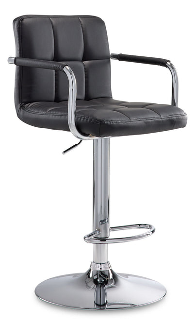 Add this modern, stylish stool to any kitchen or bar space and dine comfortably with your family or friends. Upholstered in soft tufted leather- look fabric, the sleek seat features a comforting backrest and armrest, ensuring increased comfort. The contemporary design is complemented by a chrome pedestal with gas lift and an angular footrest and base. This stool is height-adjustable to match your needs. The casual and contemporary design will easily compliment any type of décor, so your home will not only become comfortable, but more stylish. Customer assembly is required.Product Dimensions: Depth: 19.5", Diameter: 17.75", Height: 37.25", Width: 21",