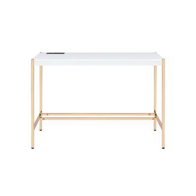 Why compromise on glamour for space when the Loher Writing Desk with USB - White offers a streamlined compact and sophisticated solution for an office space in your home. This uncomplicated design pairs a sturdy tabletop with built in USB ports and outlets for a space that makes it easy to stay powered up for long hours of work. A chic gold coloured metal base adds additional personality for an accessible modern luxury that elevates the room!This item qualifies for FREE SHIPPING. Threshold Delivery included. Part or Full customer assembly may be required.