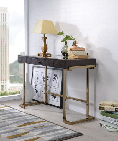 Simple and stunning, the Murmer Desk speaks of modern design with the use of a simple champagne metal base design and sleek black desk top. The desk features a middle drawer and a black glass inset top surface which brings 3 materials together to create an outstanding desk. It will create a perfect work space in your home office or bedroom.