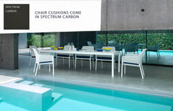 Dining chair seat cushion comes in Spectrum Carbon as shown in the swatch. (Alternate cushion colour shown in lifestyle shot)