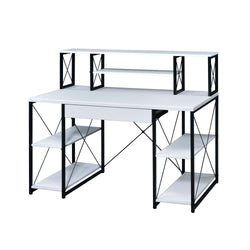 Specifically designed for all purpose, this Orville Office Desk - White / Black is suitable for study room, bedroom, living room or home office. Expertly crafted with selected veneers, manufactured wood, and metal tubes this piece has open shelving, hutch and drawer to provide ample space to store office necessities and documents.
