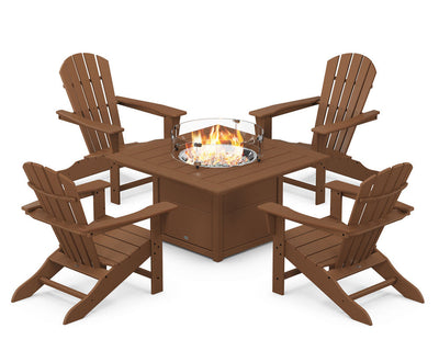 POLYWOOD® Palm Coast 5-Piece Adirondack Chair Conversation Set with Fire Pit Table - Teak