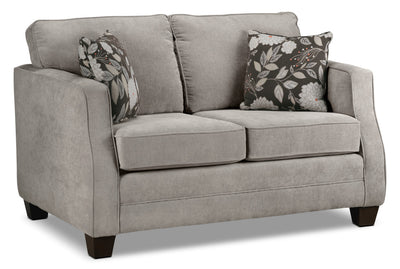 Chic Chenille. The Agnes loveseat exudes a sense of poise with features like its smart welting and taupe chenille upholstery. The soft foam seat cushions are loose and reversible for even wear, while the tailored, no-frills design leaves an impression on any contemporary living room. Floral jacquard accent pillows introduce a touch of visual flair with a complementary pattern and colours for a look that's suitably sophisticated. Made in Canada.Product Dimensions: Depth: 34", Height: 35", Width: 53",