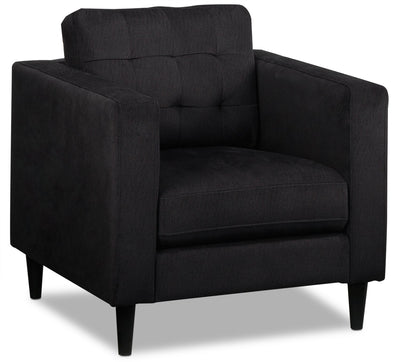 Mid-Century Mod Makeover. With the Anthena chair in charcoal, you get superior comfort without sacrificing style. Tapered, cylindrical legs offer iconic retro flair, while clean lines and high track arms balance this look with modern charm. The soft, charcoal polyester upholstery is ideal for cozy relaxation and features a button-tufted back and subtle accent stitching to complete this lounge-worthy chair.Product Dimensions: Depth: 34", Height: 34", Width: 32",