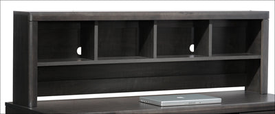 - The hutch features four upper shelves with wire management openings and a lower compartment for organizing school supplies.