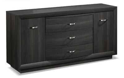 Set the Mood. Create the perfect bedroom ambiance with the Gerard dresser and its sultry, charcoal finish. Bowed drawers fronts introduce depth and dimension while sleek , stainless steel-finished hardware offers just a tocuh of shine against the smoky background. Made in Canada. Customer assembly required.Product Dimensions: Depth: 17", Height: 30", Width: 62",