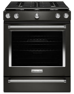 This black stainless steel, slide-in KitchenAid gas range boasts front controls, a versatile cooking surface and a True Convection element that has a unique bow-tie shape. Five burners with different power settings offer a range of cooking options, from boiling to simmering. The oven features Even-Heat™ convection that keeps the inside heated to the ideal temperature, while the Steam Rack supplies extra moisture to the interior for better cooking results.