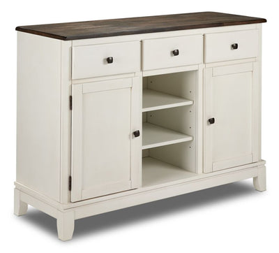- Beautiful white base with a grey-brown top finish will bring warm and inviting atmosphere to your home. Crafted from sold mango wood and select hardwood is the perfect material for a server. Mango wood is not only beautiful it's sustainable. It's also flattering to any dining area