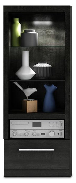 The Rhea display pier offers a sleek and modern feel with its rich, charcoal grey finish, straight lines and smooth design. Brushed nickel hardware on the storage drawer contributes to the sophisticated look. Glass shelving and energy-saving LED lighting complete the chic appearance. Made in Canada. Customer assembly is required.