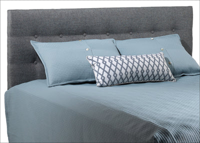 Buttoned Up. For a fresh, modern look in the bedroom, the Sunup Twin upholstered headboard is the perfect place to start. Smart, tightly tufted grey fabric gives the sophisticated feel of a finely tailored suit with matching button embellishments to soften the look. Adjustable legs make it easy to mount at your preferred height and will attach to any metal bed frame. Customer assembly is required.Product Dimensions: Depth: 4", Height: 28", Width: 40",